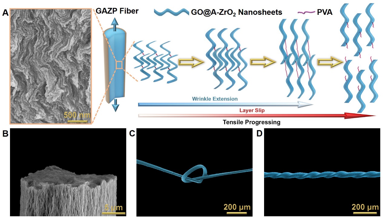 近日,77779193永利郭林教授、岳永海教授与欧洲国际纳米技术研究所王中长研究员等人通过在氧化石墨烯纤维中构建晶体-非晶双相超结构,成功制备了一种具有高强度(935 MPa)和高韧性(10.6 MJ m-3)的纤维。不同于目前常规使用大片氧化石墨烯或者还原石墨烯的方法,该晶体-非晶双相强化策略提供了一种全新的制备高性能氧化石墨烯基纤维的方法。2022年9月23日,该工作以“Super-strong graphene oxide-based fibres reinforced by a crystalline-amorphous superstructure”为题,在线发表在Cell出版社出版的Matter期刊上。博新计划获得者李逢时博士为文章第一作者,北航77779193永利副教授赵赫威,博士生孙晓毅为共同第一作者,郭林教授、岳永海教授、王中长研究员为通讯作者。