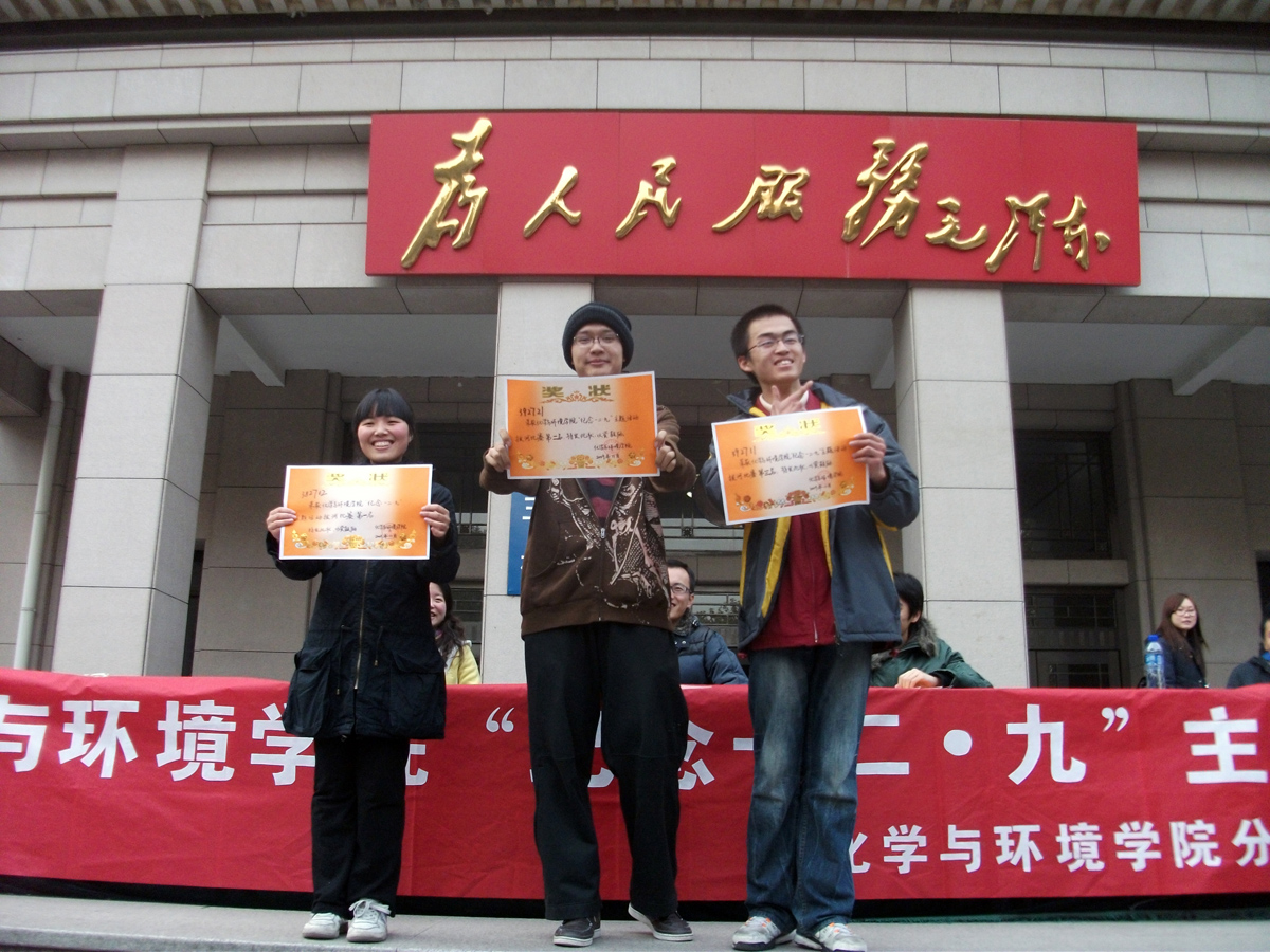 2009年11月29日下午2点,化学与环境公司在主楼前举办一二•九主题纪念活动。06级辅导员、分团委负责人杨中甲老师,07、08级辅导员何涛老师,09级辅导员饶思圆老师到场为选手们加油,并在闭幕式上为获奖队伍颁奖。其中杨中甲老师在开幕式上发表讲话,阐述了本次“纪念一二•九”主题活动的目的与意义。