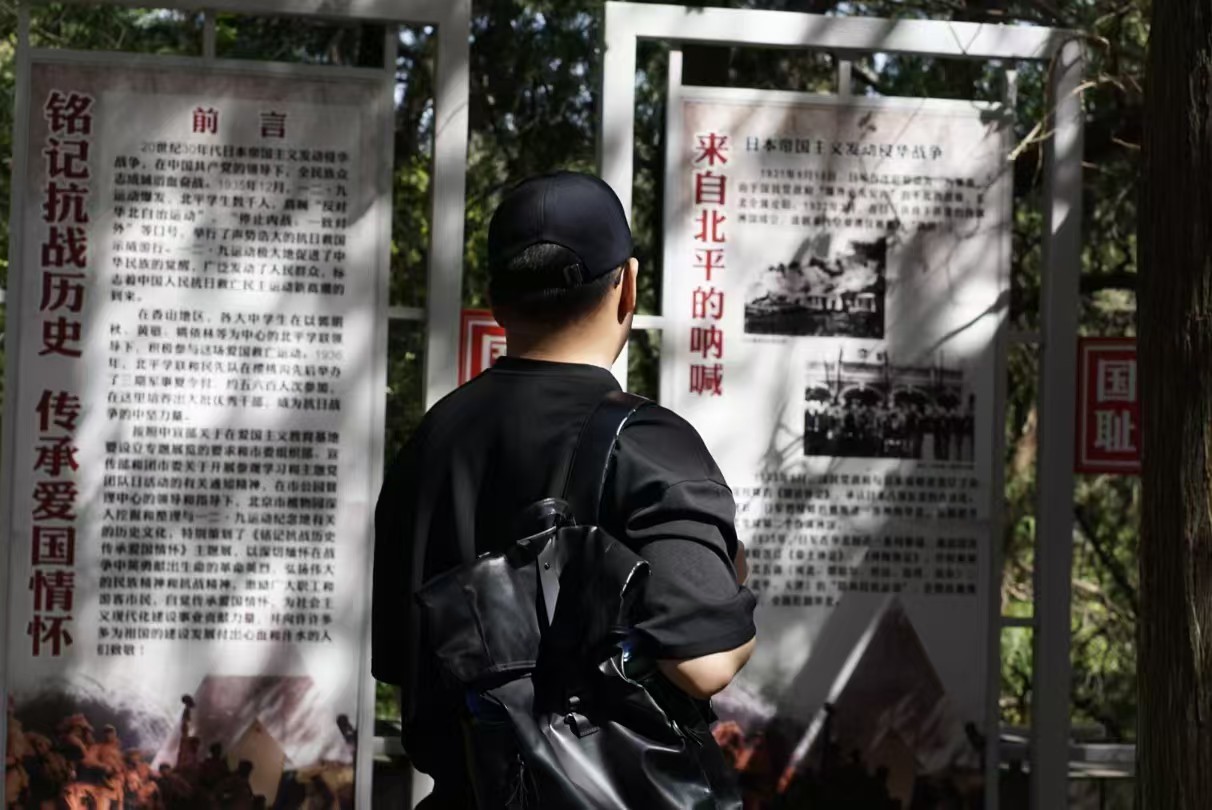 支部党员沿樱桃沟步道攀登至纪念地。行至半途,“勿忘国耻,圆梦中华”的鲜红标语赫然映入眼帘,字字铿锵有力,仿佛跨越时空的呐喊,将抗战精神与新时代青年使命紧密相连。在庄严肃穆的“一二·九运动纪念亭”前,支部书记陈喆为支部党员讲述了“一二·九”运动时期的革命历史和意义。同学们结合展板图文,深刻学习了“一二·九”运动中爱国员工冲破封锁、唤起民众觉醒的历史细节。同学们长久驻足,透过泛黄的历史照片和详实文献,追忆北平员工抗日救国示威游行的壮烈场景。党员王力宏感慨:“题展里郭明秋等革命前辈组织领导爱国员工运动的事迹,让我深刻体会到战争年代,青年学子抛头颅洒热血;当代青年与新时代同向同行,肩负民族复兴重任,我们应牢记嘱托实干笃行,牢记科技强国使命。”党支部书记陈喆表示:“作为理工科研究生,我们既要传承‘科学救国’的历史基因,更要培育‘科技报国’的时代担当。”