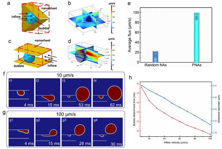 随后,作者通过微控流有限元模拟系统分析了阵列结构的传质特征与气泡逸出过程。在典型的杂乱阵列结构中,研究者发现凹坑状微观表面结构容易被气泡堵塞形成“死区”,严重阻碍液相传质与气泡输运。相比之下,作者构建的平行阵列具有高度通畅的二维微米级通道,其液相离子通量与气泡脱附输运时间均显著优于典型的杂乱阵列结构。