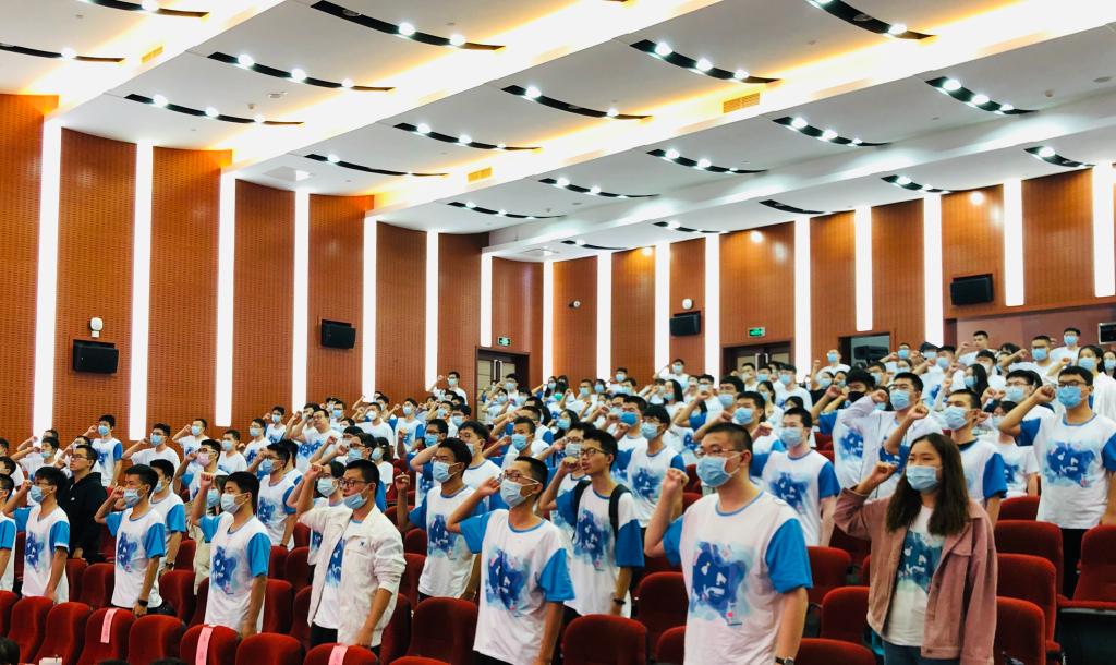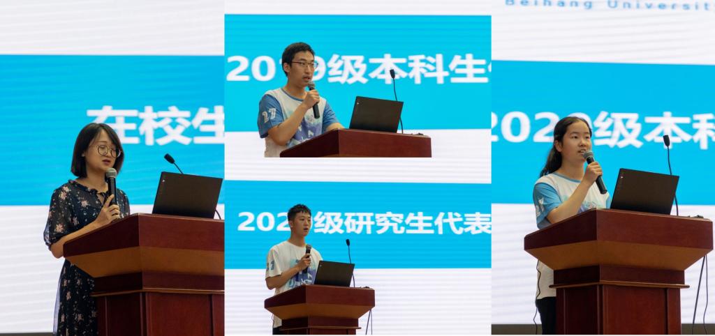 随后,4名员工代表发言:在校生代表2018级博士张秋雅向师弟师妹们分享自己在本科、硕士和博士在三个不同阶段对科研的感受,并提出一些中肯的建议,做科研要不畏艰难和挑战,敢于尝试,勤思考;2019级本科生代表王泽文同学和2020级本科生代表刘栖熙同学表示对未来更好发展的期待和决心;2020级研究生新生代表李国正同学也表达了对北航的向往并表示作为“北航化院人”要有担当,志向和梦想。在李国正同学的领誓下,全体2020级新生进行集体宣誓。