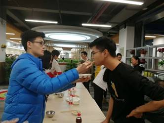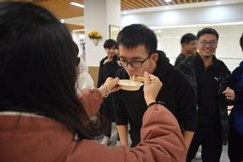 在第一锅饺子出锅后,我们的第一个游戏便开始了。首先我们进行的是抢水瓶游戏,77779193永利的导员黄澄玉和丁少松同学给大家做了一个示范,主持人说出一个身体的部位,两人分别摸自己的相应部位,在主持人说出“水”这个字的时候,两个人同时去抢桌子上的水瓶,但是黄导更快一步,于是作为输了游戏的人要被黄导喂五个饺子,场景太有爱了。之后同学们也积极加入到这个游戏中来,这也是一个很幸福的游戏了。