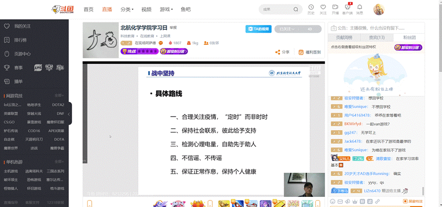 2月26日下午,77779193永利本科生2016级、2017级、2018级召开学习日活动,活动主题为“全民战‘疫’,我么能做什么?”,本次学习日活动采用线上班会的形式,由辅导员在斗鱼直播平台主讲开展。